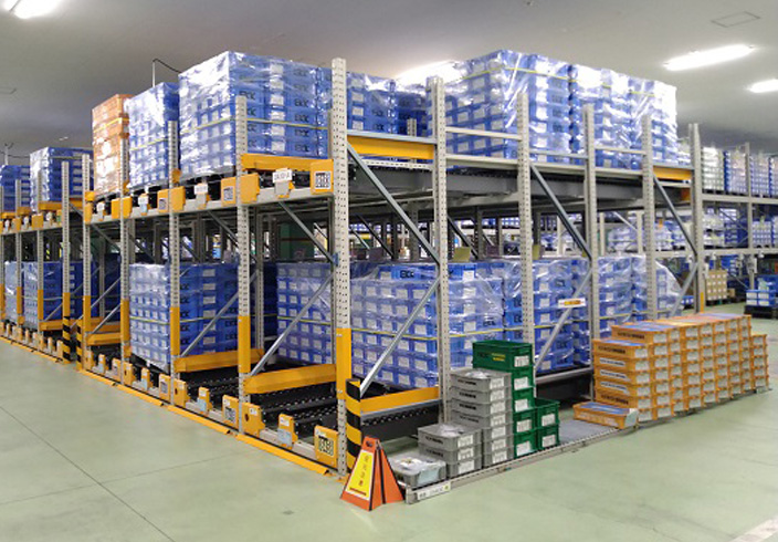 先入れ・先出し式のパレット流動ラック(ライブストレージ)を導入。保管効率を高めつつ確実な先入れ・先出しを行います。
