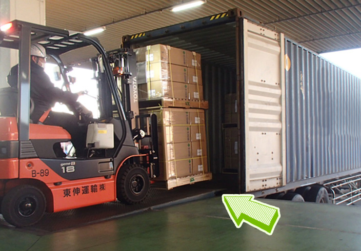 各倉庫ドッグレベラーを設置しています。コンテナやトラック荷台との段差をなくし、破損防止につなげています。