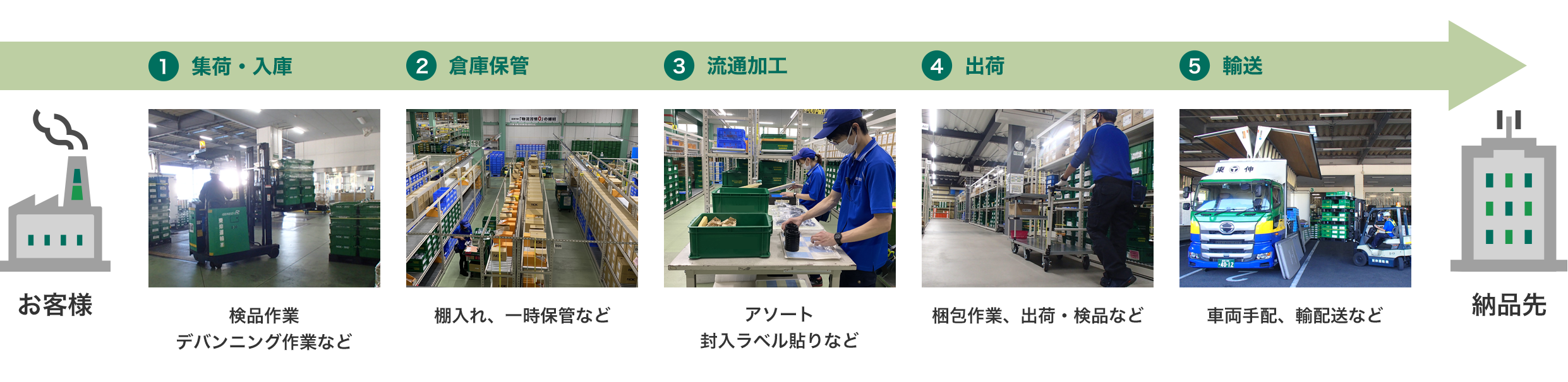 入庫から倉庫保管・在庫管理、加工作業、輸配送まで、ワンストップで物流アウトソーシングいただけます。